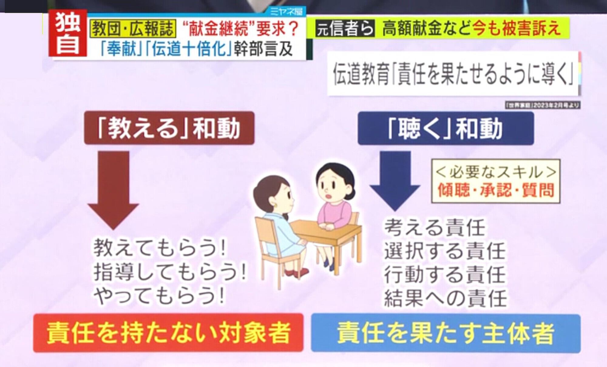 「尋訪プロジェクトは、通っていたけど辞めた人、2世でも教団から離れている人など、一度教団を離れた人を訪ねていき、もう一度教団のイベントに誘うなどして、教団に再復帰させるというものです。伝道教育のやり方は教団がマニュアル化しているのですが、『一方的に教えるわけではなく、相手に自分で考えさせ、判断させ、責任を持たせる形で伝道しなさい』ということを言っています」