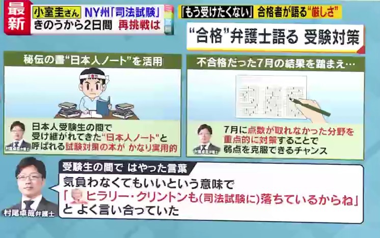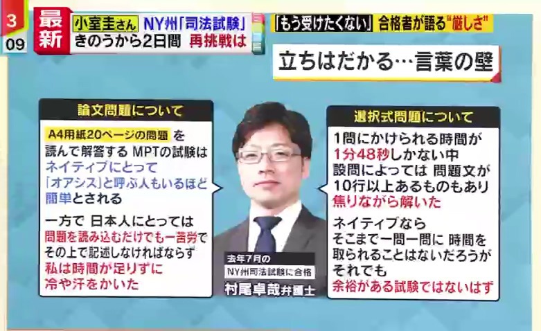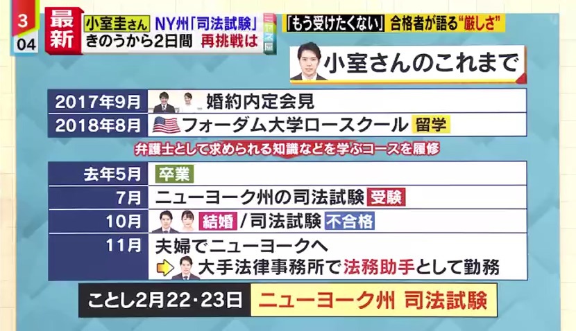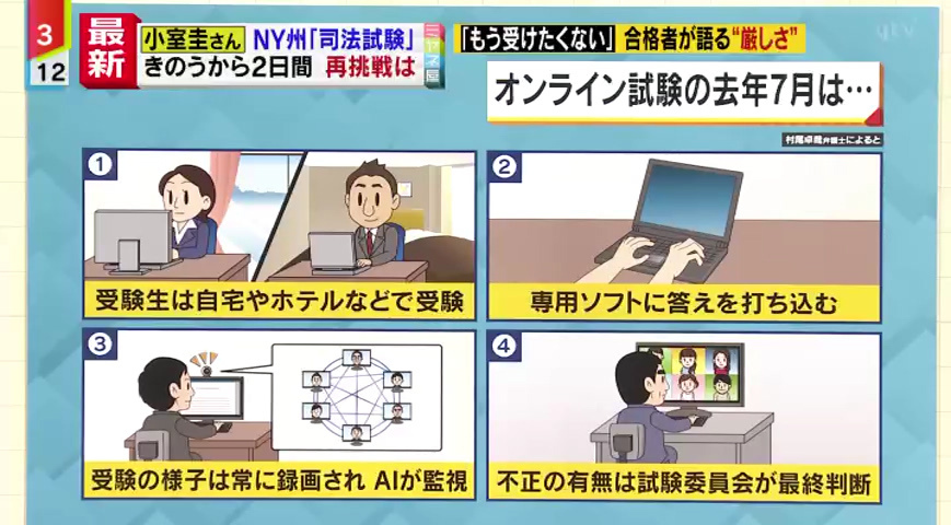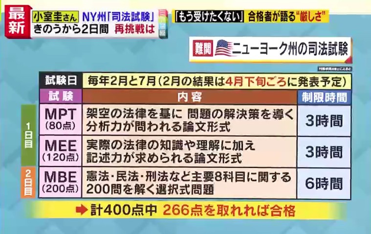 アメリカ・ニューヨークでは、2月22日から司法試験が行われています。眞子さんと結婚した小室圭さんは、去年7月の試験で不合格となった後、法律事務所で働きながら、今回の試験に向けて準備を進めてきたものとみられています。小室さんと同じ試験を受け合格した日本人弁護士を取材したところ、その過酷な試験の舞台裏、そして合格の“秘策”の存在も、明らかになりました。