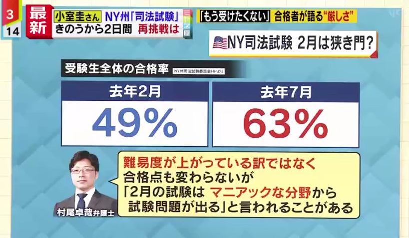 司法試験は、毎年2月と7月に行われるのですが、実はその合格率に差があると言います。2021年の場合、2月は合格率49%、そして小室さんが受けた7月は63%でした。村尾弁護士によると、「難易度や合格点が変わっているわけではないが、マニアックな分野から問題が出されるようだ」とのことです。