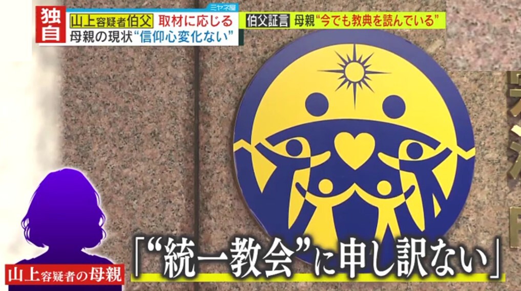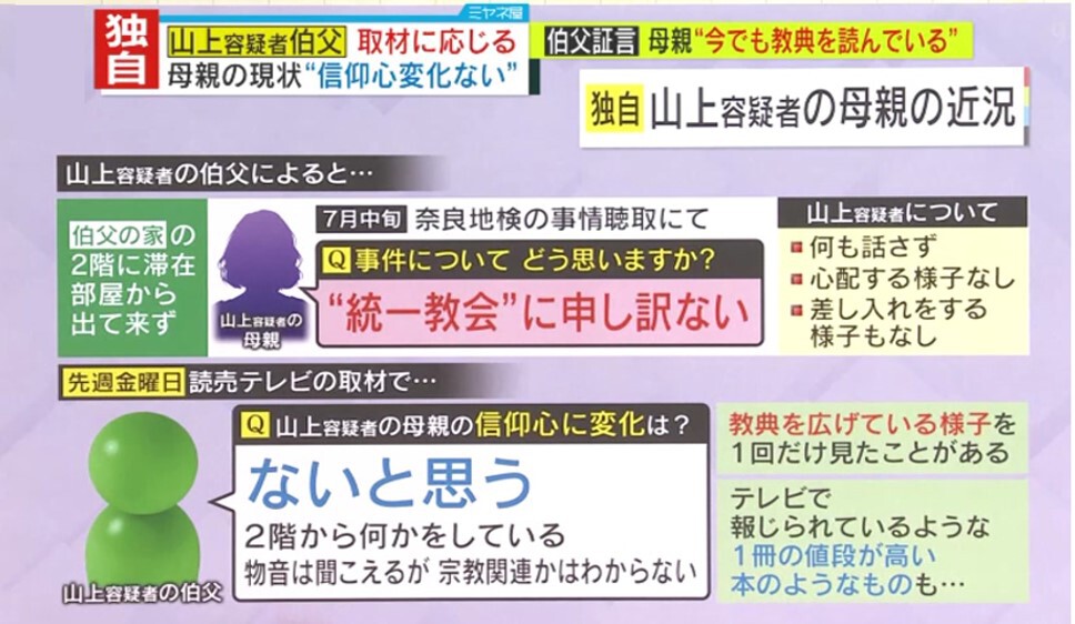 山上容疑者の伯父(山上容疑者の父親の兄)によると、山上容疑者の母親は「謝罪会見を開きたい。世間に謝りたい」などと話し、8月7日に伯父の自宅を出て、その後の家族との電話で「支援者の庇護のもと、大阪市内のホテルにいる」と明かしたということです。また、8月5日の読売テレビの取材に対し伯父は、母親の信仰心について「変化はないと思う。2階から何かをしている物音は聞こえるが、宗教関連かはわからない」と答えました。ただ、母親が「教典を広げている様子を1回だけ見たことがある。テレビで報じられているような、1冊の値段が高い本のようなものもあった」とも話しています。母親はこれまでの奈良地検の事情聴取で、「“統一教会”に申し訳ない」と話していましたが、現在の支援者が“統一教会”の関係者かどうかは分かっていません。