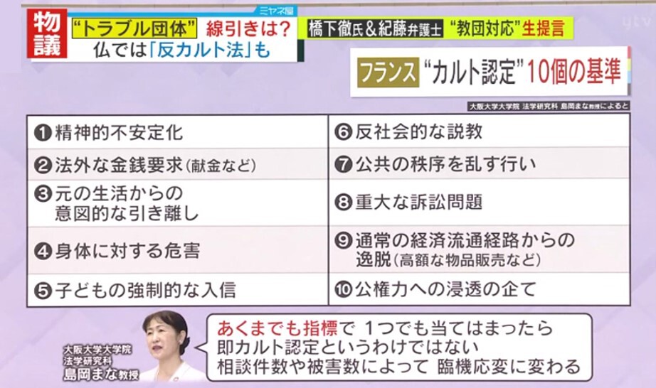 フランスのカルト認定には10の指標があります。例えば、「精神的不安定化をもたらす」「法外な金銭要求(献金など)をする」「重大な訴訟問題を抱えている」「通常の経済流通経路からの逸脱(高額な物品販売など)」などが当てはまると、カルトに認定される可能性があるということですが、大阪大学大学院法学研究科の島岡まな教授によると「あくまでも指標で、一つでも当てはまったら即カルト認定ということではない。相談件数や被害者数によって臨機応変に変わる」ということです。