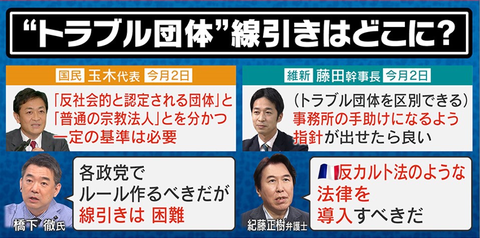 政界と“統一教会”の関係が続々と明らかにされている中、国民民主党の玉木代表は「反社会的と認定される団体と普通の宗教法人とを分かつ、一定の基準は必要」とし、維新の藤田幹事長は「トラブル団体を区別できる、事務所の手助けになるよう指針が出せたら良い」としています。これについて紀藤弁護士は、「フランスの反カルト法のような法律を導入すべきだ」としています。