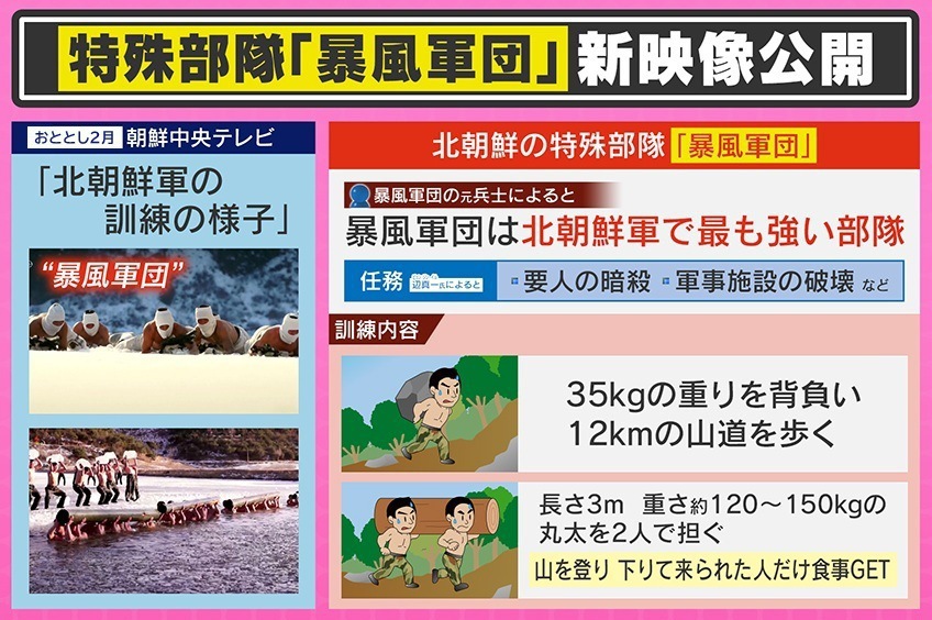 2023年2月に、朝鮮中央テレビで軍の訓練の様子が報じられました。『暴風軍団』と呼ばれている特殊部隊で、『暴風軍団』の元兵士によると、北朝鮮軍で最も強い部隊だといいます。辺氏によると、任務の内容は『要人の暗殺や軍事施設の破壊』などだということです。