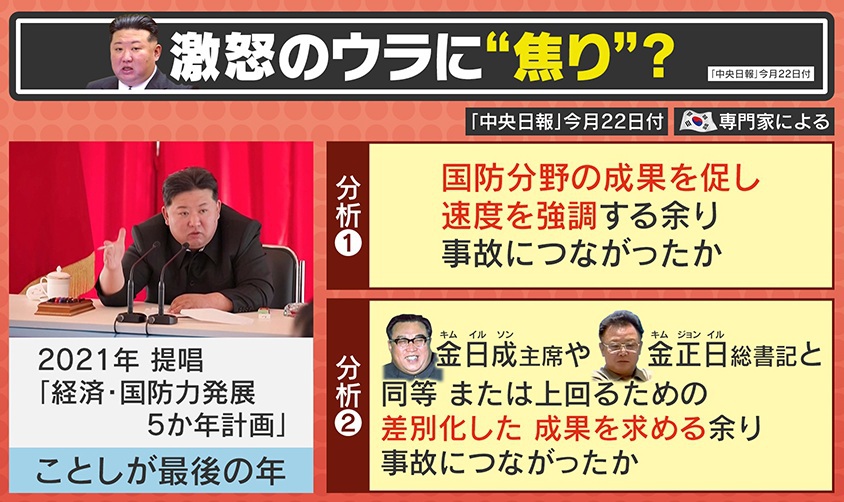 2025年5月22日付の『中央日報』によると、金総書記は、2021年に「経済・国防力発展5か年計画」というものを提唱していて、2025年が最後の年だといいます。韓国の専門家の分析によると、「国防分野の成果を促し、速度を強調するあまり、事故につながったのではないか」「金日成(キム・イルソン) 主席や金正日(キム・ジョンイル)総書記と同等、または上回るための差別化した成果を求める余り、事故につながったのではないか」ということです。