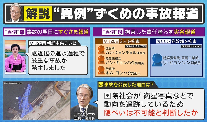 そして、事故の翌日に、朝鮮中央テレビでは「駆逐艦の進水過程で厳重な事故が発生しました」と異例の報道がされました。2025年5月25日、造船所のカン・ジョンチョル技師長、船体総組立のハン・ギョンハク職場長、行政府のキム・ヨンハク支配人の3人を拘束したと実名報道しています。