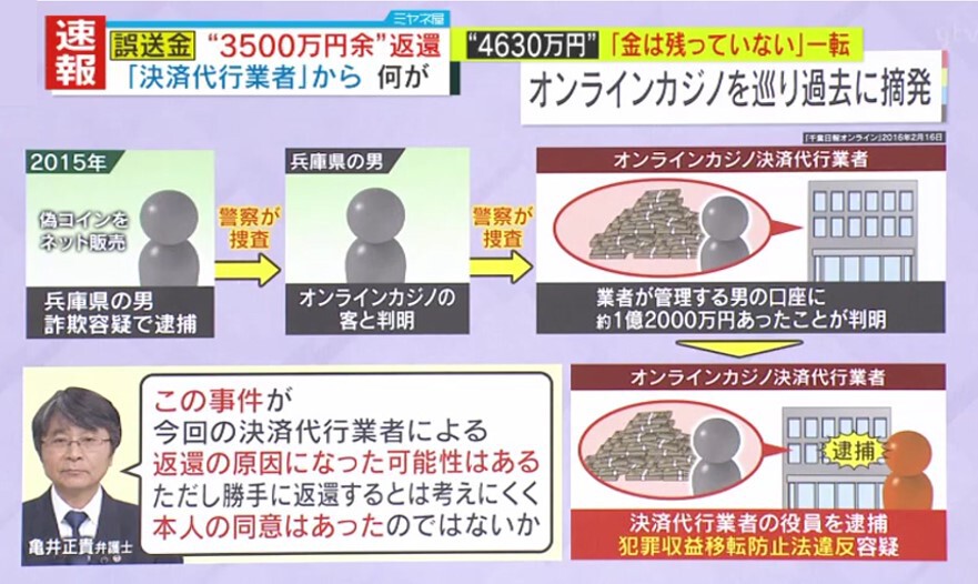 過去には、オンラインカジノを巡る摘発事例がありました。2015年、偽コインをネットで販売した男が詐欺容疑で逮捕され、この男を警察が捜査したところ、男はオンラインカジノの客と判明。そして、オンラインカジノ決済代行業者が管理する男の口座に、約1億2000万円があったことが明らかになったことにより、決済代行業者の役員は「犯罪収益移転防止法違反」の容疑で逮捕されたということです。亀井弁護士は、「この事件が今回の決済代行業者による返還の原因になった可能性はある」としています。ただし、「勝手に返還するとは考えにくく、本人の同意はあったのではないか」ということです。