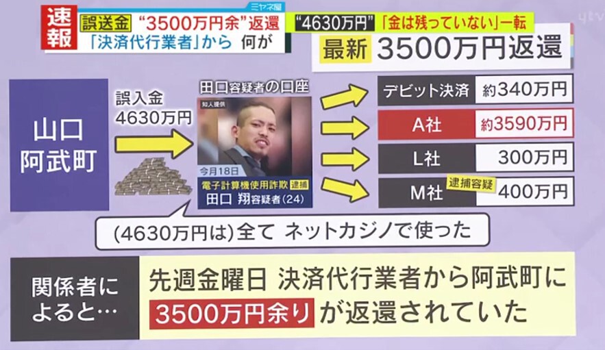山口県阿武町(あぶちょう)の職員が、“新型コロナ”の臨時給付金として4630万円を24歳の男性に誤って送金した問題で、決済代行業者から阿武町に3500万円余りが返還されていたことが明らかになり、さらに阿武町が24日に行った会見で、法的措置によって約4300万円を確保できたことを明らかにしました。「複数のネットカジノで全て使った」と、接見した弁護士に話していた田口翔容疑者。その証言に偽りがあったのでしょうか?大阪地検の元検事・亀井正貴(かめい・まさき)弁護士と、ネットワーク犯罪に詳しい石川英治(いしかわ・ひではる)さんが解説します。