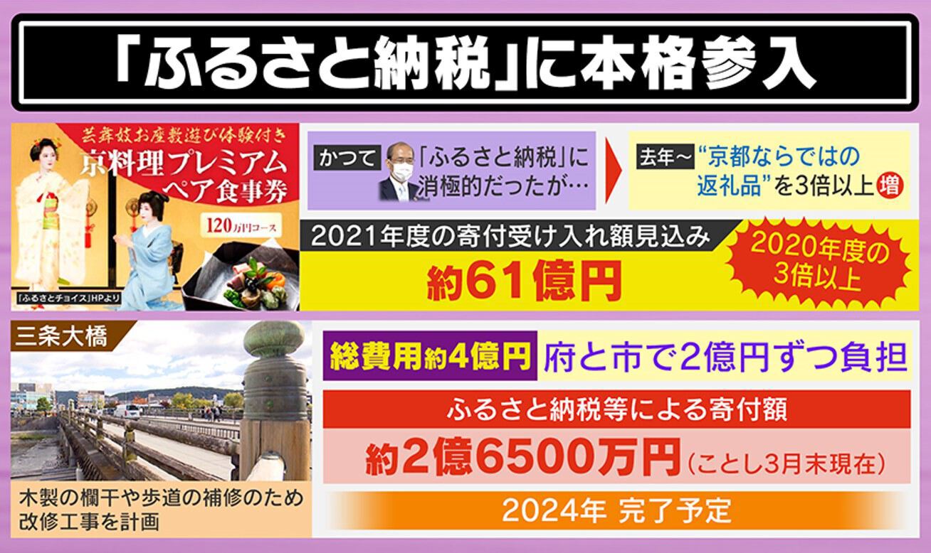 さらに京都市は、収入を増やす取り組みとして、「ふるさと納税」に本格参入を決めました。京都市はこれまで「ふるさと納税」には消極的でしたが、2021年から“京都ならではの返礼品”を、それまでの3倍以上に増やしたところ、寄付受け入れ額が2020年の3倍以上となる61億円に上る見込みとなりました。また、三条大橋の補修にかかる市の負担金を、「ふるさと納税」による寄付で集めたところ、予算の2億円を超えた2億6500億円が集まりました。