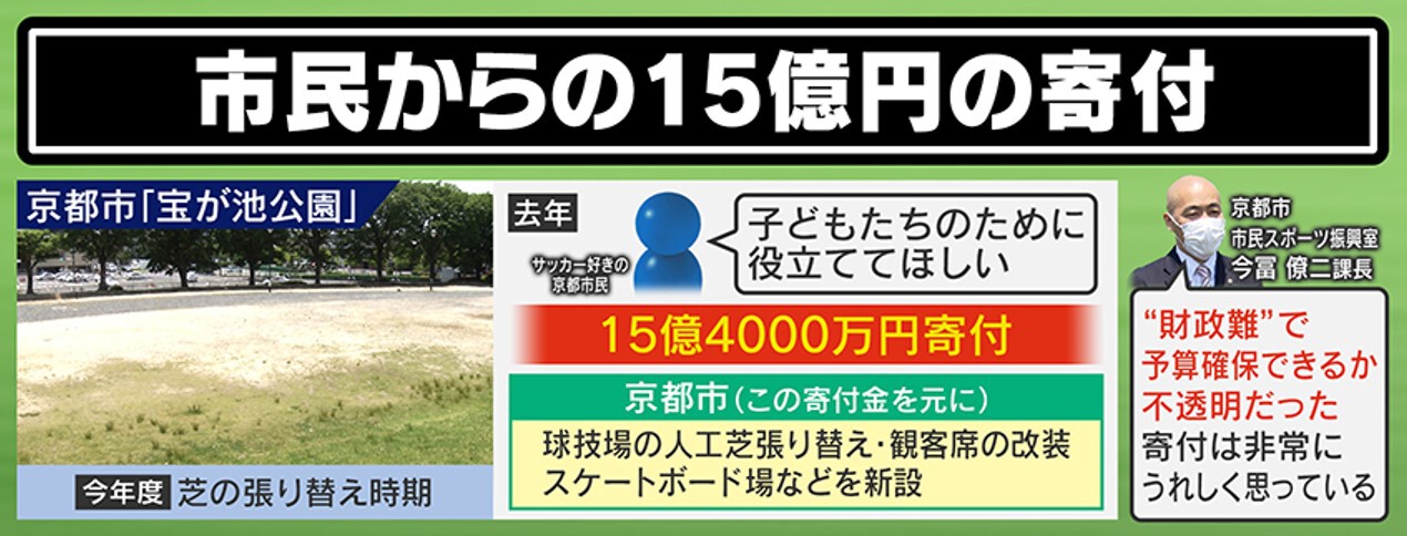 また、芝が張り替え次期を迎えていた「宝が池公園」に対し、“サッカー好きの京都市民”から、「子どもたちのために役立ててほしい」ということで、15億4000万円の寄付がありました。京都市はこの市民と折衝をして、この寄付金を基に、球技場の芝の張替えや観客席の改装、宝が池公園へのスケートボード場の新設などを行いました。スポーツ振興室の課長は「“財政難”で予算確保できるか不透明だった。寄付は非常にうれしく思っています」と話しています。