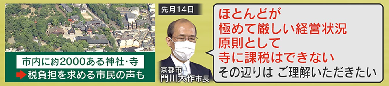 税収に関しては、京都市は人口の約1割が学生で、さらに高齢者も多いため、納税義務がある人の割合が、政令指定都市で最低の43.1%しかありません。さらに、景観保全のため高いマンションが立てられないこともあって、多くの固定資産税が見込めないという事情もあります。また、京都市内に約2000ある神社・寺に対して、税負担を求める市民の声もありますが、5月に京都の門川市長は「ほとんどが極めて厳しい経営状況。原則として寺に課税はできない。その辺は、ご理解いただきたい」と苦しい胸の内を明かしました。