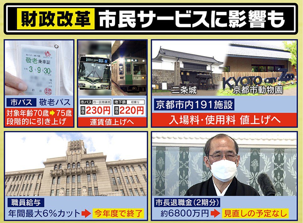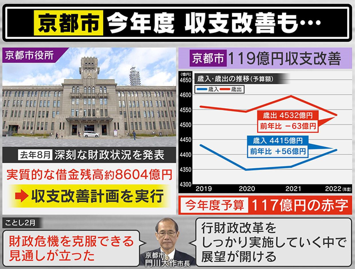 京都市は2021年8月、実質的な借金残高が約8600億円余りにのぼる深刻な財政状況を発表し、5カ年計画で収支改善計画を実行中です。その結果、歳出はマイナス63億円・歳入がプラス56億円で、119億円の収支を改善しました。しかし、いまだ今年度の予算は117億円の赤字のままです。にもかかわらず市長は、「財政危機を克服できる見通しが立った」と強気なコメントを出し、「行財政改革をしっかり実施していく中で展望が開ける」と語りました。