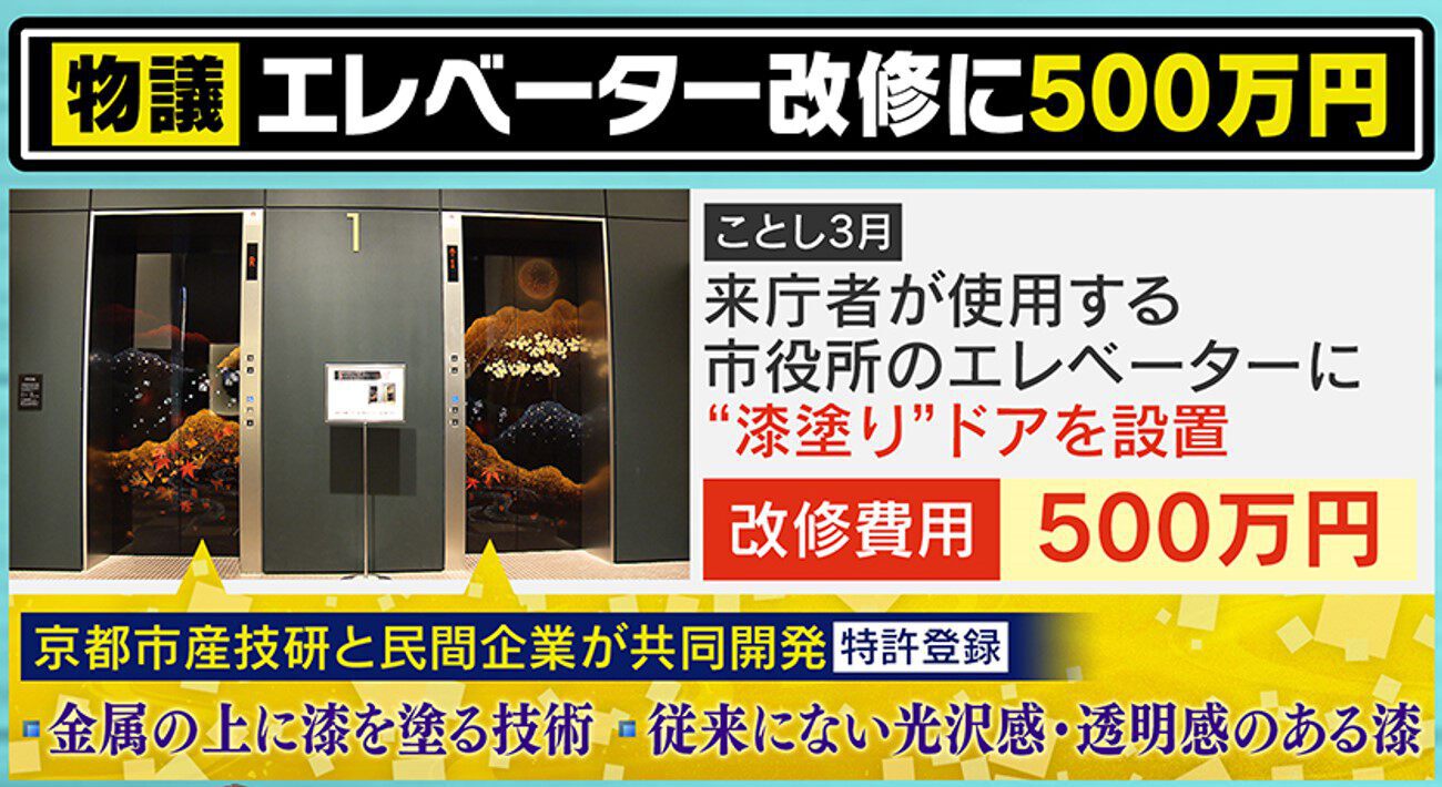 このような中、3月に完成した市庁舎1階・来庁者用エレベーターの“漆塗りドア”の改修費用が約500万円だったことが分かりました。この漆塗りは、京都市の産技研と民間企業が共同開発し、特許登録もしているということで、「新しく金属の上に漆を塗る技術を使って、従来にない光沢感・透明感があり、伝統産業の活性化への思いを込めた」ということです。しかし市民からは、「わざわざ見に来る人がいるとは思えない」「変なプライドが高いんじゃないか、もうそんな時代じゃないと」といった怒りの声もあがりました。