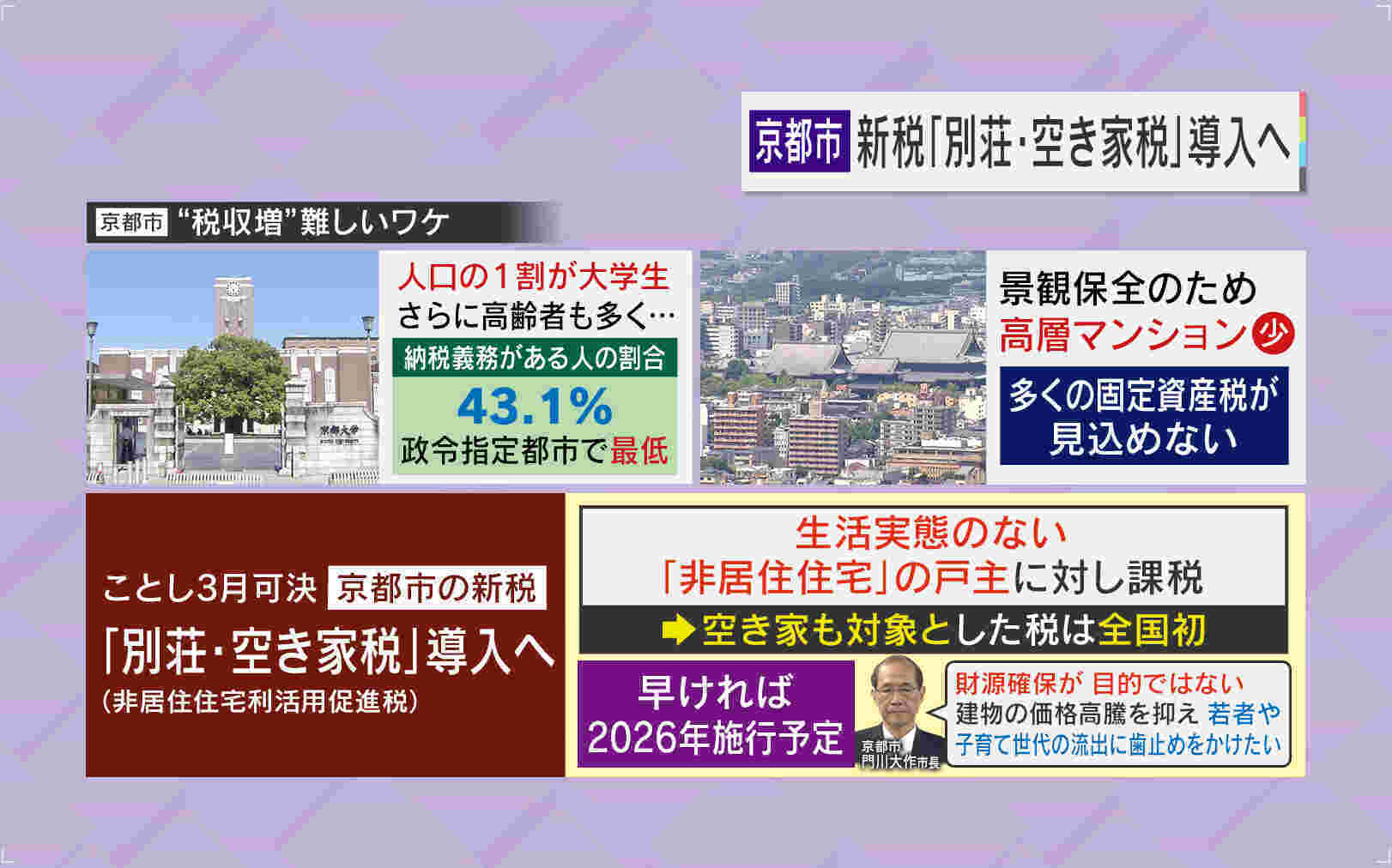 そこで3月に京都市は、新税「別荘・空き家税」を議会で可決しました。これは生活実態のない非居住住宅の戸主に対し課税するもので、空き家も対象とした税は全国初であり、早ければ2026年の施行だということです。