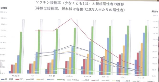 「ご参考までに申し上げると、これ(手元のフリップ)は埼玉県の例なんですけれども、棒線は年代ごとのワクチンの接種割合、折れ線は年代ごとの新規陽性者10万人当たりの数を表しています」