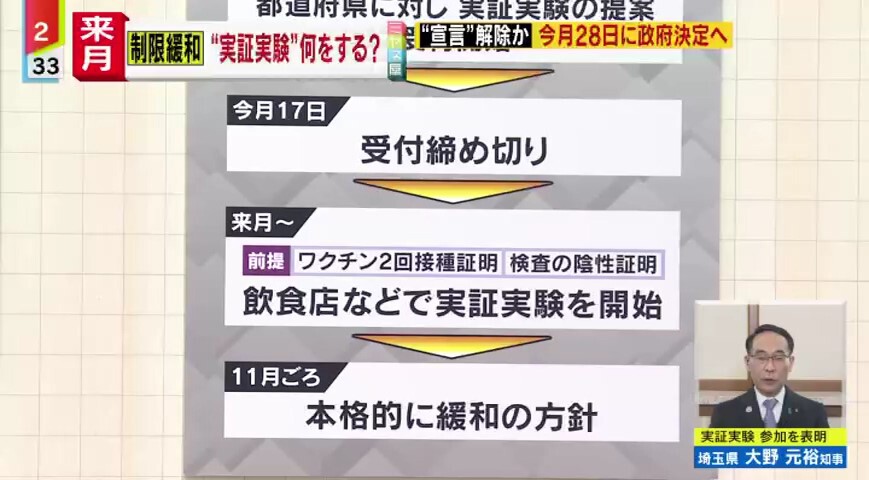 「都道府県によって状況が違いますので、埼玉のケースは1つのモデルとして、そこはしっかりとお示しをしたい。それからもう1つは、やはりワクチンの接種が随分進んできているので、そこでの効果を試すということもあるので、単なる緩和ではないと思っています」
