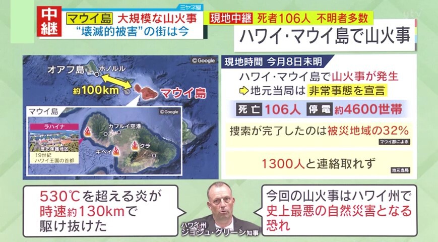 ハワイ・マウイ島の山火事で、106人の死亡が確認され、1300人と連絡が取れていません(日本時間8月16日午後2時50分時点)。現地の様子は?必要な支援は?現地を取材するNNNマウイ島カフルイ・岡田光弘記者から最新情報です。