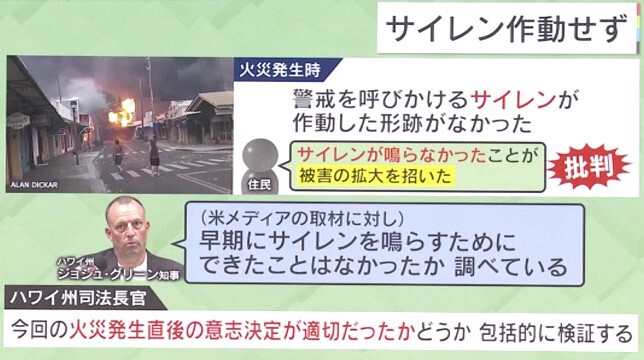 ここまでの被害拡大を招いた一因は、「火災発生時に警戒を呼びかけるサイレンが鳴らなかったからだ」と、住民から批判の声が上がっています。サイレンが作動した形跡はなく、米メディアの取材に対しグリーン知事は、「早期にサイレンを鳴らすためにできたことはなかったか、調べている」とし、ハワイ州司法長官も「今回の火災発生直後の意思決定が適切だったかどうか、包括的に検証する」と述べています。
