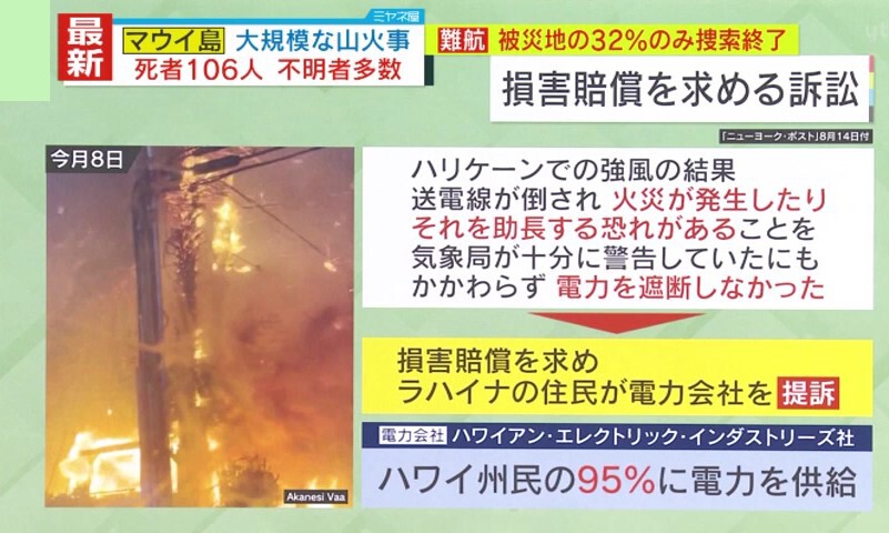 混乱が続く現地で、損害賠償を求める訴訟の動きが出ています。「ハリケーンでの強風で送電線が倒され、火災が発生したり、それを助長する恐れがあることを気象局が十分に警告していたにもかかわらず、電力を遮断しなかった」として、ラハイナの住民が損害賠償を求め、電力会社を提訴しました。