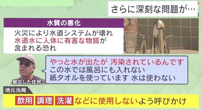 また、被災者の今の生活にも深刻な問題が山積みで、問題視されているのが「水質の悪化」です。火災により水道システムが壊れ、水道水に人体に有害な物質が含まれている恐れがあり、地元当局は飲用・調理・洗濯などに使用しないよう呼びかけています。