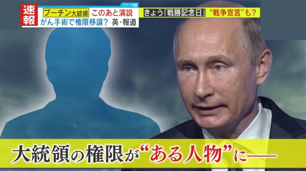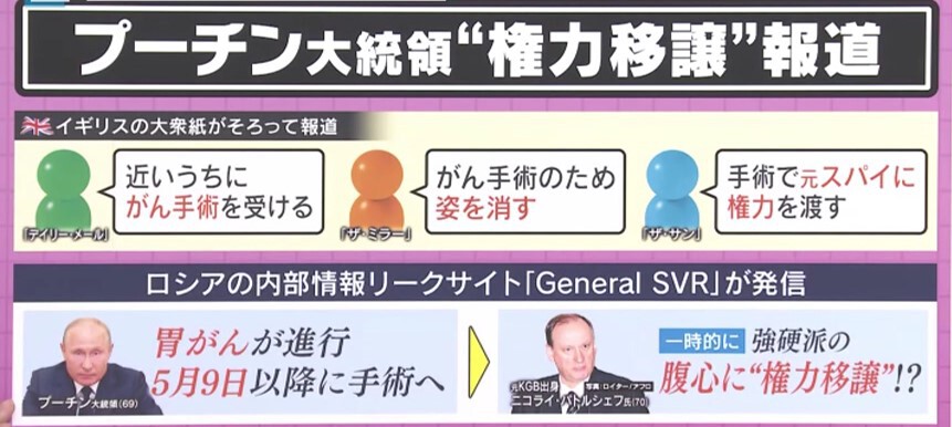 イギリスの大衆紙は、プーチン大統領が「近いうちにがんの手術を受ける」、「手術で元スパイに権力を渡す」などと伝えています。ロシアの内部情報のリークサイトも、「胃がんが進行していて、5月9日以降に手術をする。一時的に強硬派の腹心、パトルシェフ氏に権力を移すのではないか」としています。