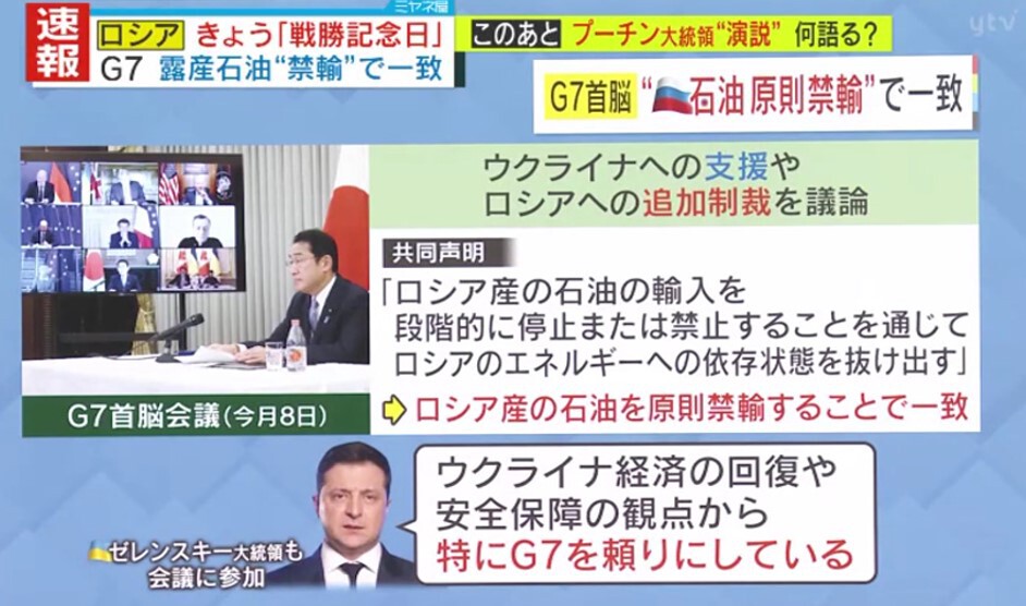 5月8日、G7・主要7か国はオンライン首脳会議を開催。ウクライナのゼレンスキー大統領も出席する中、一致して取り組むこととなったのが、“ロシア産石油の輸入禁止”です。岸田首相は、「輸入停止の時期は実態をふまえ検討する」と述べ、国民生活などへの悪影響は最小化する方法をとるとしています。