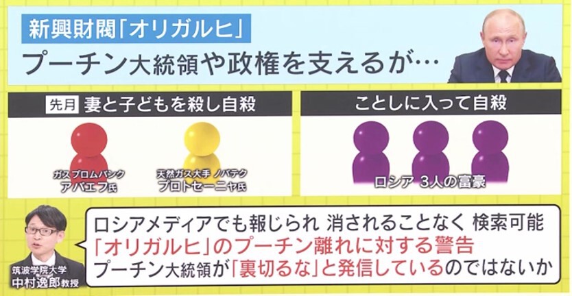 そんなプーチン政権と密接につながる、新興財閥「オリガルヒ」の不審死が相次いでいるということです。4月には銀行大手の「ガス プロムバンク」、そして、天然ガス大手「ノバテク」の2人が妻と子どもを殺して自殺。さらに、ロシアの3人の富豪が今年に入って自殺したということです。筑波学院大学・中村逸郎教授によると「この「オリガルヒ」の不審死は、情報統制が敷かれているロシアメディアでも報じられていて、消されることなく情報は検索可能。オリガルヒのプーチン離れに対する警告。プーチン大統領が『裏切るな』と発信しているのではないか」ということです。