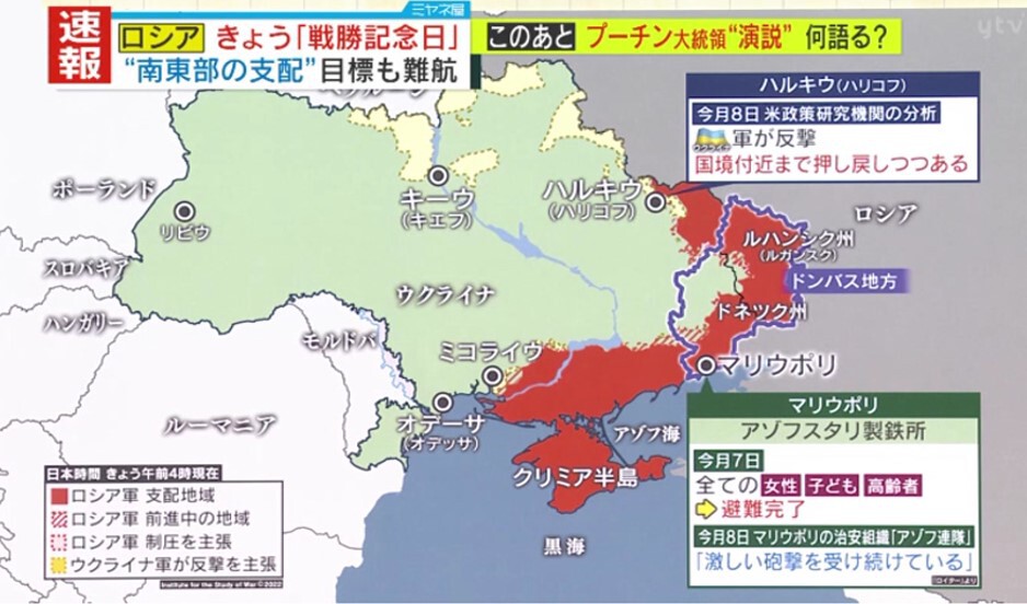 マリウポリの「アゾフスタリ製鉄所」では5月7日、全ての女性・子ども・高齢者は避難完了したと伝えられています。ただ、マリウポリの治安組織「アゾフ連隊」は、5月8日の段階で「激しい砲撃を受け続けている」としています。また、アメリカ政策研究機関の分析では、ハルキウではウクライナ軍が反撃して、ロシア軍を国境付近まで押し戻しつつあるという情報があります。