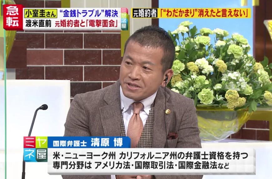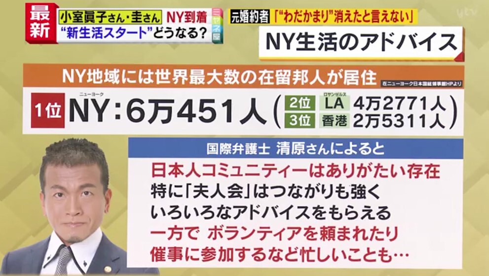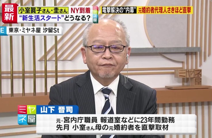 11月14日、アメリカ・ニューヨークに到着し、新天地での生活をスタートさせた、小室眞子さんと圭さん夫妻。出発の2日前には、小室さんの母親の元婚約者と“金銭トラブル”の解決で電撃合意。面会の場では、いったい何があったのでしょうか?その裏側をミヤネ屋が独自取材しました。元宮内庁職員で皇室ジャーナリストの山下晋司さんと、国際弁護士の清原博さんが独自解説します。