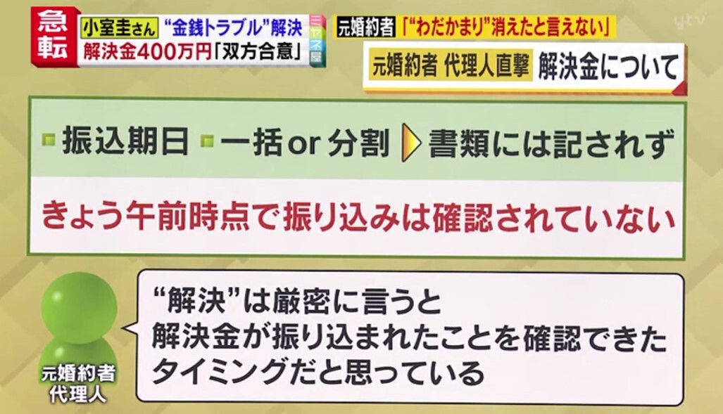 400万円といわれる解決金ですが、振り込みの期日や一括なのか分割なのかは書類には記されていなかったということです。また、11月15日午前時点で振り込みは確認されていないということです。元婚約者の代理人の方は、「解決は厳密にいうと解決金が振り込まれたことを確認できたタイミングだと思っている」と話しています。