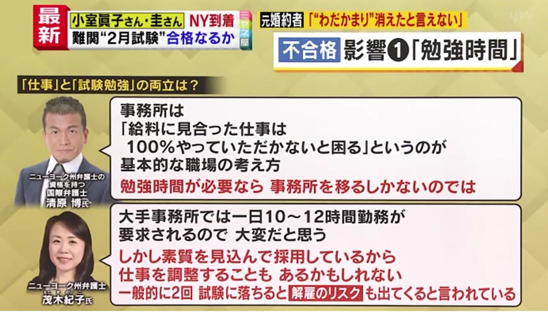 「難しいですよ。もちろん勉強しなければいけないのですが、ただ小室さんは3年間、ロースクールでちゃんと勉強されたので、受かるだけの実力はあると思っています。仕事の手を抜くことはできませんので、あくまでも自分のプライベートの時間で受験勉強するしかないですから、なかなか厳しい状況だなと思いますね。ですから眞子さんがサポートしていただかないと、小室さんはなかなか勉強する時間が確保できないのかなと思います。」