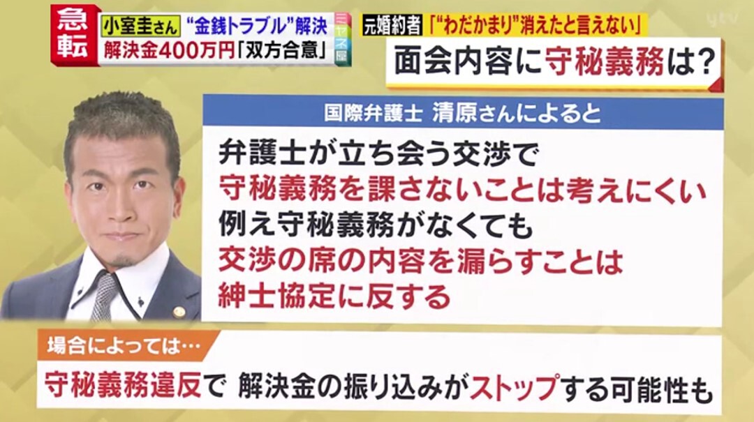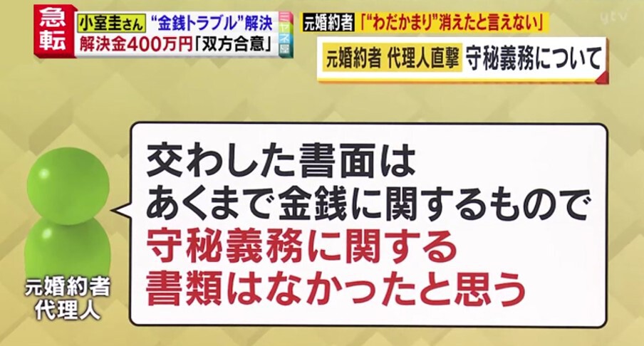 ミヤネ屋の独自取材に対して、元婚約者の代理人は「交わした書面はあくまで金銭に関するもので、守秘義務に関する書類はなかった」ということです。