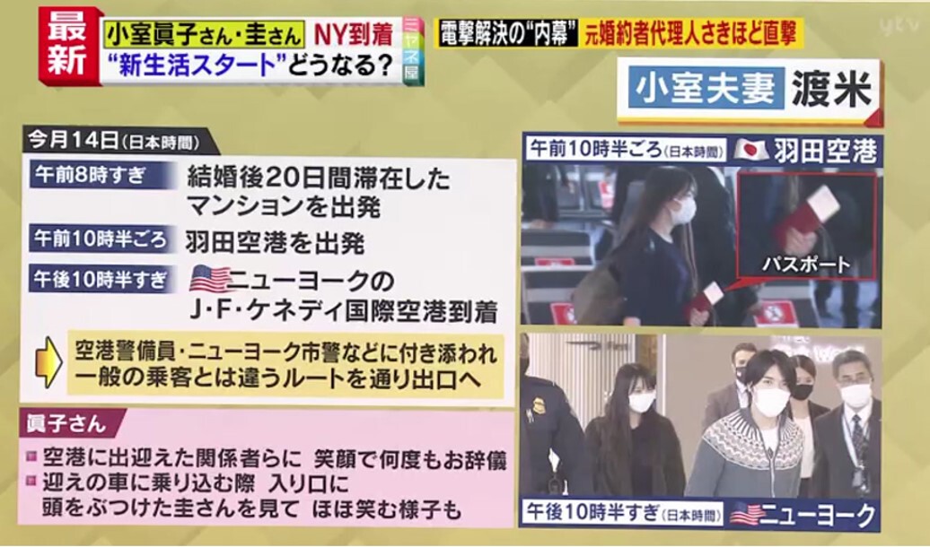 午前10時半ごろ羽田空港を出発。日本時間、14日夜10時半すぎに小室眞子さん・圭さん夫妻を乗せた飛行機がニューヨークのケネディ国際空港に到着。約30分後、ニューヨーク市警や空港の警備職員に先導され報道陣の前に姿を見せました。2人は一般の乗客とは別のルートを通って空港の外へ。