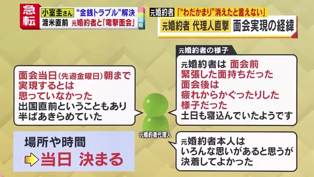 ミヤネ屋の独自取材に対して元婚約者の代理人は、「面会当日(11月12日)朝まで実現するとは思っていなかった、出国直前ということもあり半ばあきらめていた」と明かしました。時間や場所が決まったのも当日。元婚約者は、面会前は緊張した面持ちでした。面会後は疲れからかぐったりした様子で、土、日も寝込んでいたようだということです。元婚約者本人はいろんな思いがあると思うが、決着してよかったということです。