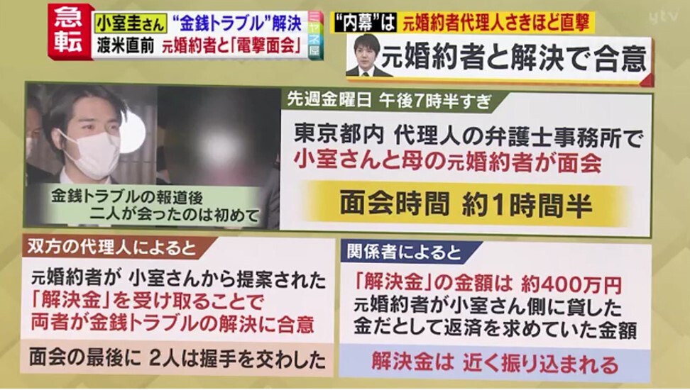 約1時間半に及んだ面会は、双方の代理人によると元婚約者が、小室さんから提案された「解決金」を受け取ることで両者が“金銭トラブル”の解決に合意したといいます。その金額は、約400万円。これは元婚約者が 小室さん側に「貸した」と、返済を求めていた金額で、近く振り込まれる予定だといいます。面会の最後、小室さんと元婚約者は握手を交わしたといいます。