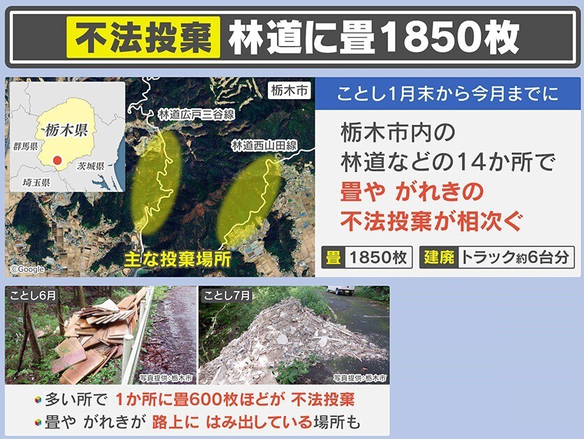 2025年1月末~8月までに、栃木市内の林道などの14か所で不法投棄が相次いでいます。不法投棄されたのは畳1850枚・建設廃材トラック約6台分で、多い所で1か所に畳600枚ほどが捨てられ、畳やがれきが路上にはみ出している場所もあるということです。