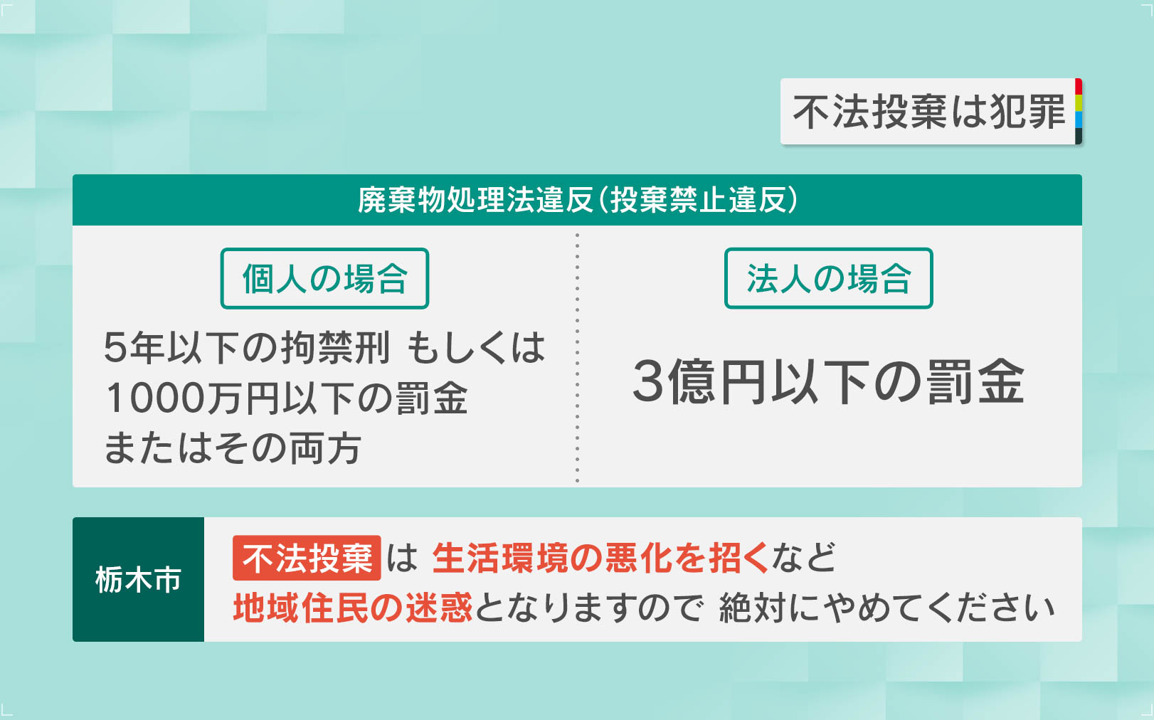 廃棄物処理法違反(投棄禁止違反)は、個人の場合「5年以下の拘禁刑もしくは1000万円以下の罰金またはその両方」、法人の場合は「3億円以下の罰金」が科せられます。栃木市は、「不法投棄は生活環境の悪化を招くなど、地域住民の迷惑となりますので、絶対にやめてください」と注意喚起しています。