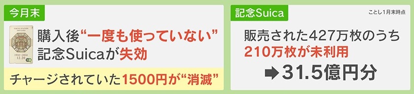 そんな記念Suicaですが、購入後“一度も使っていない”と2026年3月末で失効となり、チャージされていた1500円分が消滅します。販売された427万枚のうち210万枚が未利用(2026年1月末時点)で、単純計算で31.5億円分になります。