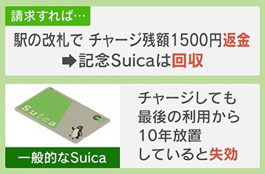 もし失効しても、請求すれば駅の改札でチャージ残高1500円は返金されます。ただ、記念Suicaは回収されてしまいます。実は一般的なSuicaも、最後の利用から10年放置していると失効するということです。