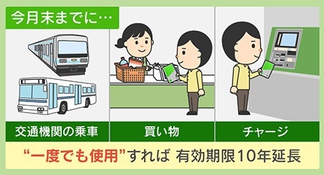 1500円分を消滅させないためには、2026年3月末までに『交通機関の乗車』『買い物』『チャージ』などで一度でも使用すれば有効期限が10年延長されます。