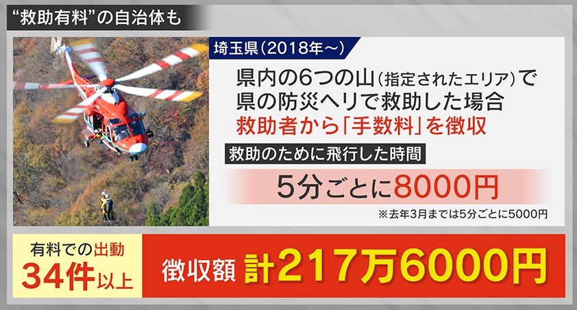 一方で、救助有料の自治体もあります。埼玉県では2018年から、県内の6つの山(指定されたエリア)で県の防災ヘリで救助した場合、救助者から『手数料』を徴収。救助のために飛行した時間5分ごとに8000円(2024年3月までは5分ごとに5000円)となっています。これまで有料での出動が34件以上あり、徴収額は計217万6000円だということです。