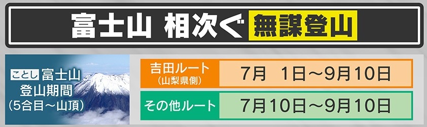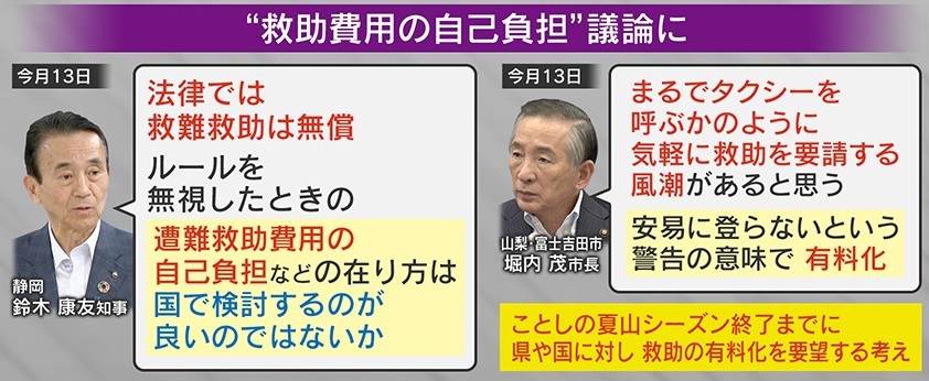 静岡県・鈴木康友知事は、「法律では救難救助は無償。ルールを無視したときの遭難救助費用の自己負担などの在り方は、国で検討するのが良いのではないか」としていて、富士吉田市・堀内市長も、「まるでタクシーを呼ぶかのように気軽に救助を要請する風潮があると思う。安易に登らないという警告の意味で有料化」として、ことしの夏山シーズン終了までに、県や国に対し救助の有料化を要望する考えを示しています。