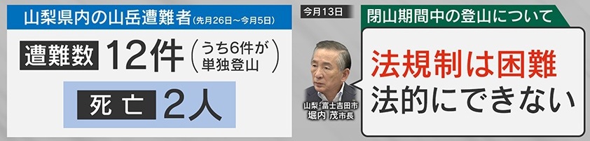 2025年4月26日~5月5日までの山梨県内の山岳遭難者は、遭難数12件(うち6件が単独登山)・死亡2人となっています。しかし、山梨・富士吉田市の堀内茂市長によると、閉山期間中の登山については「法規制は困難、法的にできない」ということです。