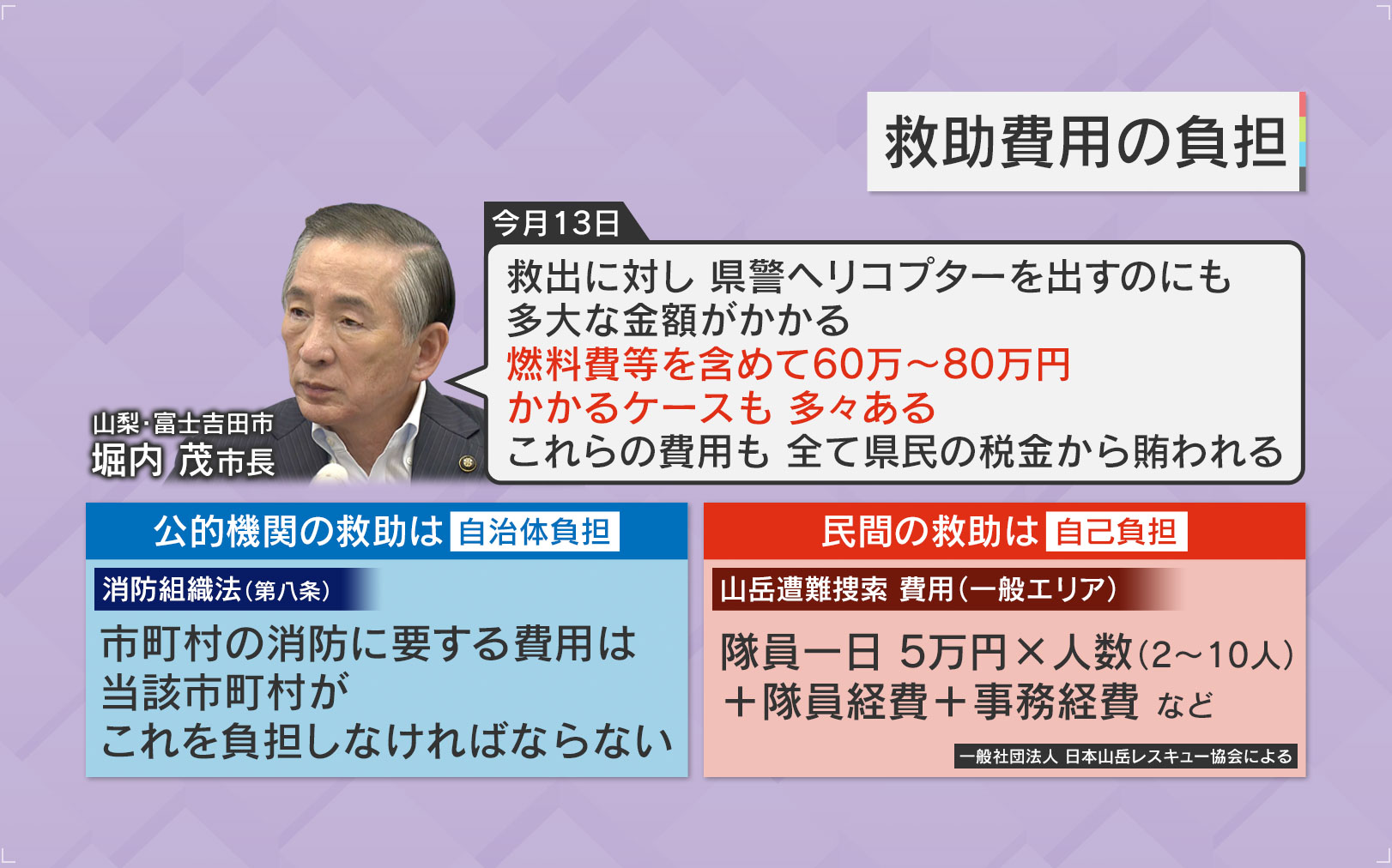 救助費用の負担について、富士吉田市・堀内市長は「救出に対し県警ヘリコプターを出すのにも多大な金額がかかる。燃料費等を含めて60万~80万円かかるケースも多々ある。これらの費用も全て県民の税金から賄われる」と話しています。