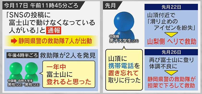 しかし、5月17日午前11時45分ごろ、「SNSの投稿に富士山で動けなくなっている人がいる」と通報があり、静岡県警の救助隊7人が出動。午後4時半ごろ、救助隊が中国籍・自称大学生の男性2人を発見しました。男性らは、「一年中、富士山に登れると思った」と話したということです。
