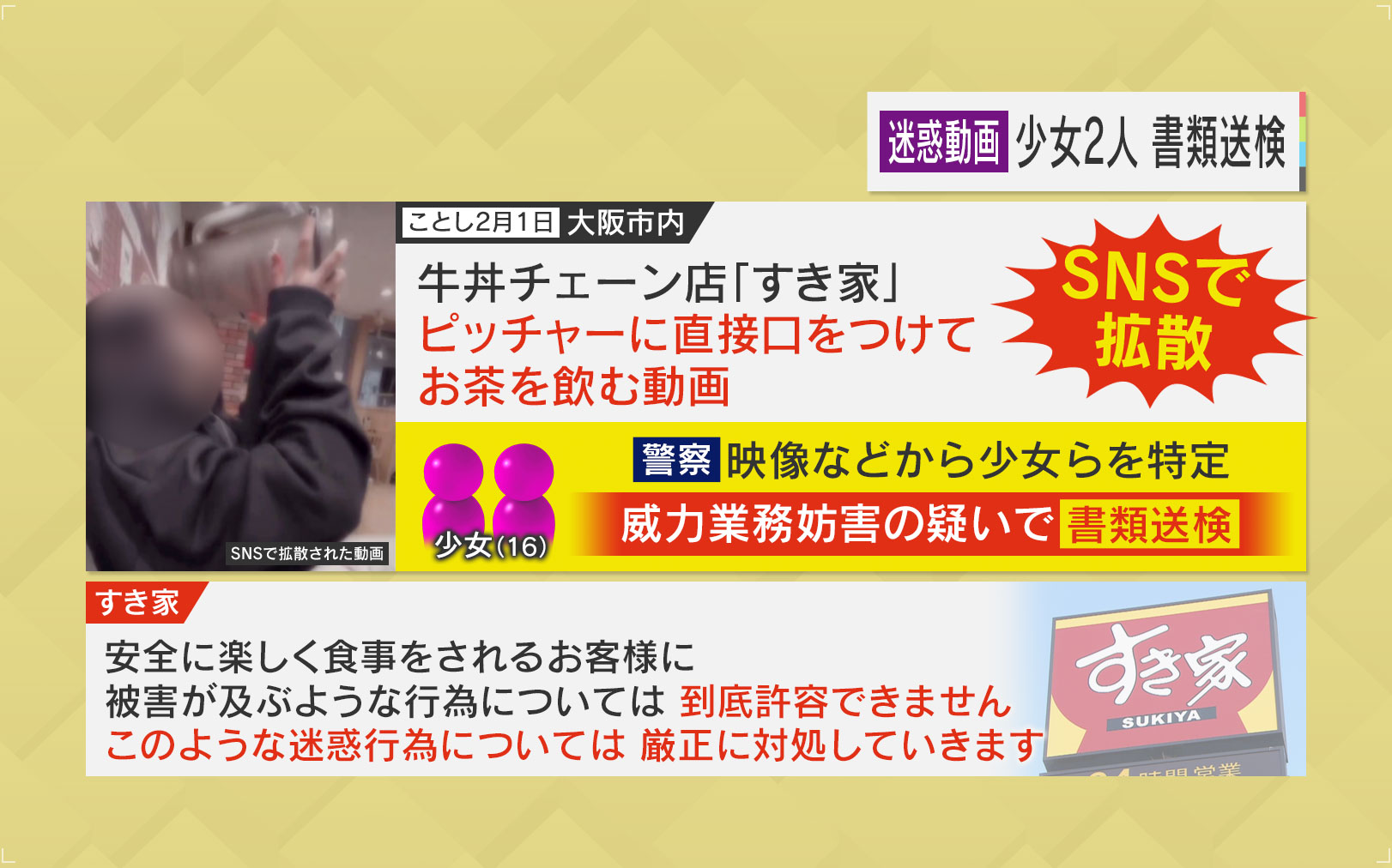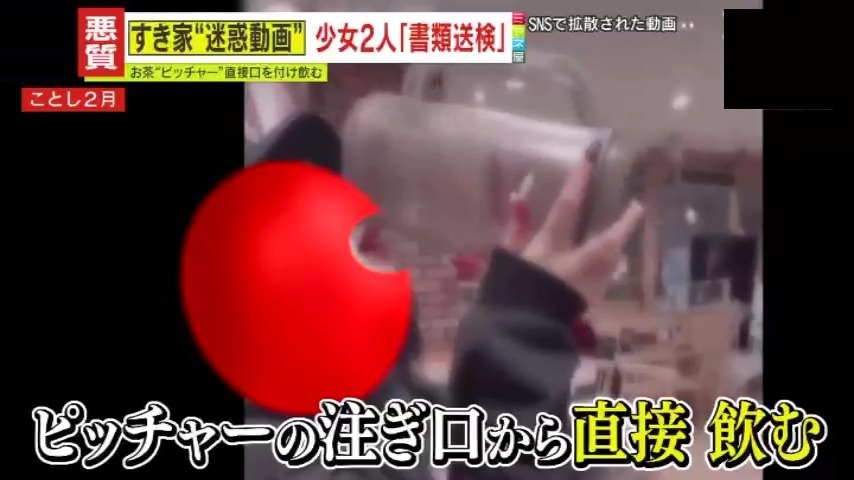 2025年2月、大阪市内の牛丼チェーン『すき家』の店内で撮影された、とんでもない迷惑動画。共用のピッチャーに直接口をつけ、お茶を飲む少女。撮影している少女が、煽るように声をかけます。