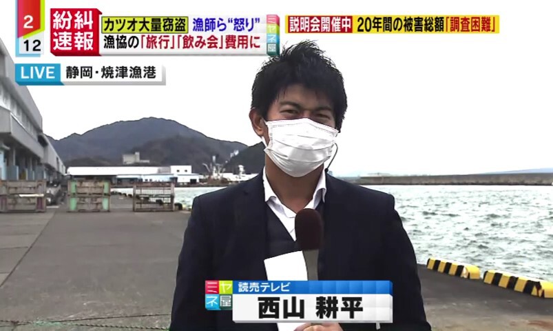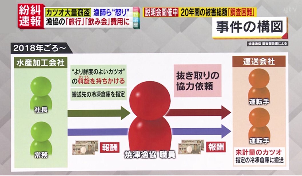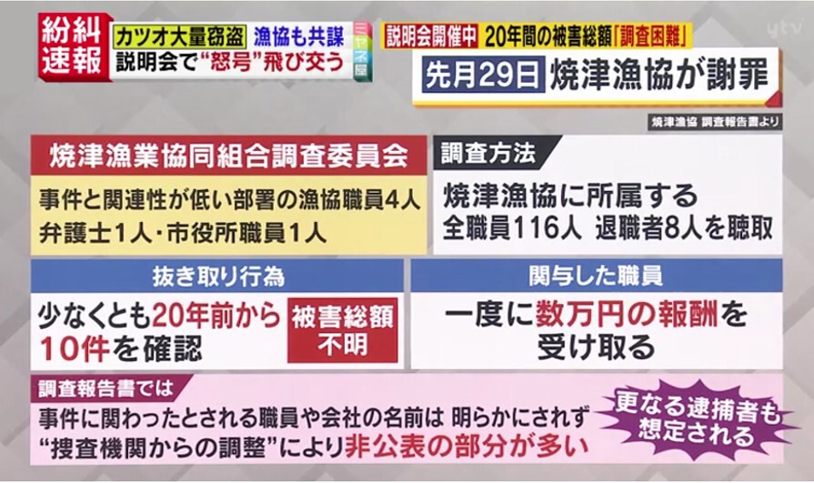 静岡・焼津(やいづ)港で行われていた“冷凍カツオ”の窃盗。漁協の調査によると、少なくとも20年前から“抜き取り行為”が行われていた事が分かりました。怒りをにじませる漁業関係者に対して、焼津漁協が説明会を行いました。現地・焼津漁港から読売テレビの西山耕平ディレクターが最新情報を伝えます。