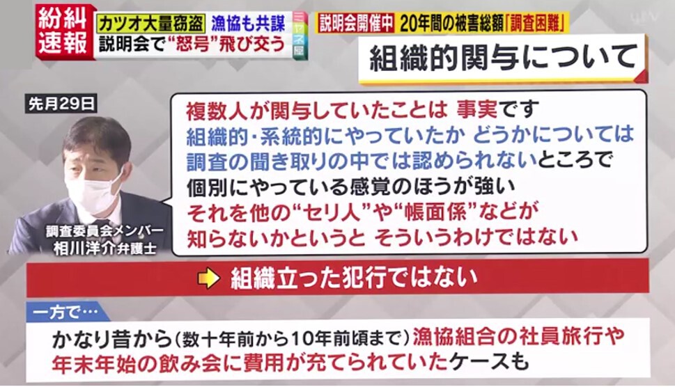 「おっしゃる通りです。盗まれたお金が、関係者らの飲み会や旅行に充てられていたという事実があるわけで、これは漁協も認めていますので、経営者らからしてみますと『組織ぐるみだったんじゃないか』と疑う声は当然だと思います。」
