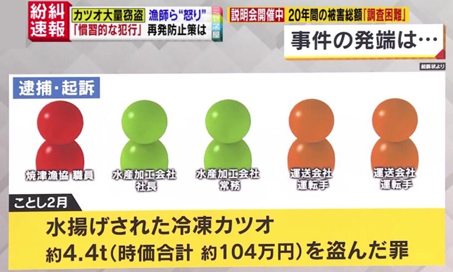 “盗まれた”と怒りの声を上げているのは、静岡県焼津漁港の漁業関係者たち…その怒りの理由は、漁師が血と汗を流して水揚げしたカツオが、抜き取られていたからでした。しかも、逮捕・起訴されたのは、焼津漁協職員、水産加工会社の社長と常務、運送会社の運転手2人の計5人。あろうことか、漁協関係者による犯行でした。抜き取られたカツオの量は、この3年間で、4.4トン、時価約104万円に上ります。