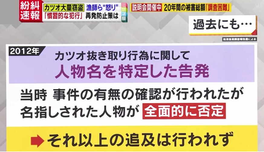 実は2012年にも、“カツオ抜き取り行為”に関して、人物名を特定した告発が行われていました。当時は、事件の有無の確認は行われましたが、名指しされた人物が全面的に否定したため、それ以上の追及は行われなかったということです。