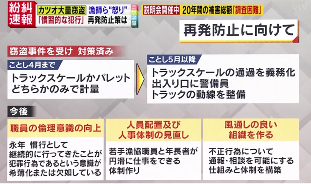 焼津漁協は再発防止に向けて、2021年4月までは、トラックスケールかパレットのどちらかのみで計量していましたが、2021年5月以降は、トラックスケールの通過を義務化し、出入り口には警備員を配備、トラックの動線を整備しました。今後は、職員の倫理意識の向上、人員配置や人事体制の見直し、風通しの良い組織を作るということです。